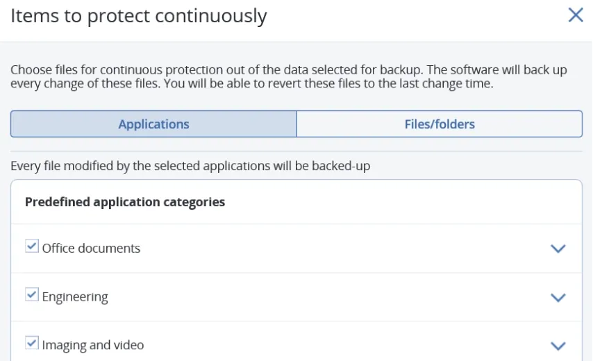 Özelleştirilebilir uygulama listesi sayesinde, kullanıcıların kritik verilerinin hiçbir zaman kaybolmamasını sağlayın. Acronis ajanı, belirtilen uygulamalarda yapılan tüm değişiklikleri (dosyaların kaydedildiği konumdan bağımsız olarak) anlık olarak takip eder ve sürekli yedekler. Sistem kurtarma gerektiğinde, verileri yedekten geri yükleyip en son değişiklikleri uygulayarak veri kaybını tamamen önleyebilirsiniz.