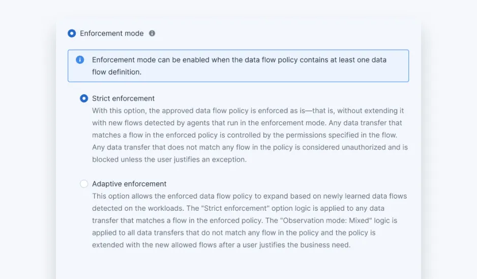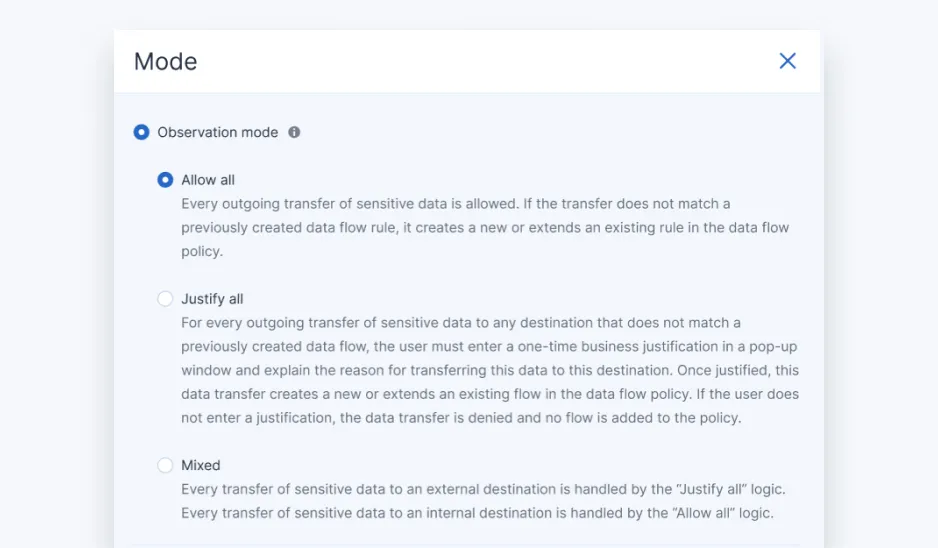 Daha sıkı kontroller gerektiren müşteriler için, DLP politikalarını tanımlandığı şekilde uygulayabilir, ayrıca gözlem modu döneminde gözlemlenmeyen yeni veri akışlarını da engelleyebilirsiniz.