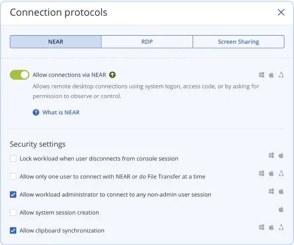 Acronis’in güvenli NEAR protokolü, ajansız bağlantılar için Hızlı Yardım (Quick Assist), oturum kayıtları ve dosya aktarım yetenekleri dahil olmak üzere gelişmiş özelliklerle uzaktan desteği geliştirin. Bu, ek uzak masaüstü çözümlerine olan ihtiyacı ortadan kaldırır, teknisyenler ve müşteriler arasında sorunsuz iş birliği sağlar ve uyumluluk için merkezi güvenlik ve oturum izleme sunar.
