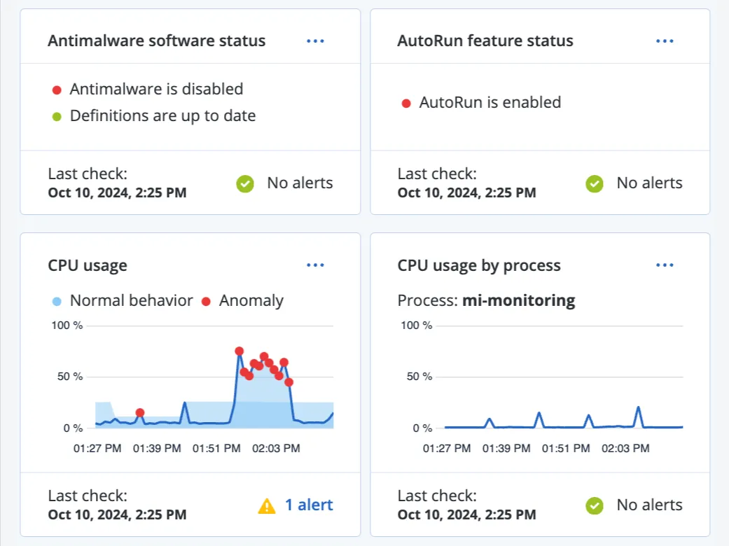 Kötü amaçlı yazılımdan koruma izlemesi ve güvenlik duvarı durumu dahil olmak üzere Windows ve macOS için 24 sistem ve donanım performans metriğini ve ayrıca özel metrikleri izleyin.