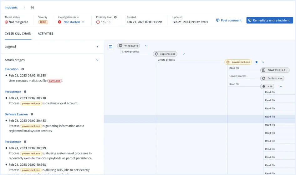 Çözüm, olayları uç nokta düzeyinde izler ve bunları olay başına saldırı zinciri grafiğinde otomatik olarak ilişkilendirir.